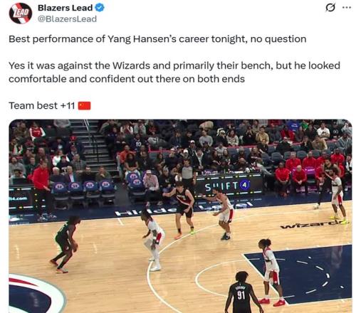 赛后开拓者媒体Blazers Lead也发文称赞到:“毫无疑问,今晚是杨瀚森生涯最佳表现,虽然对手是奇才,主要对阵的还是轮换球员,但他在攻防两端打得游刃有余,信心满满,正负值+11更是全场最佳。”